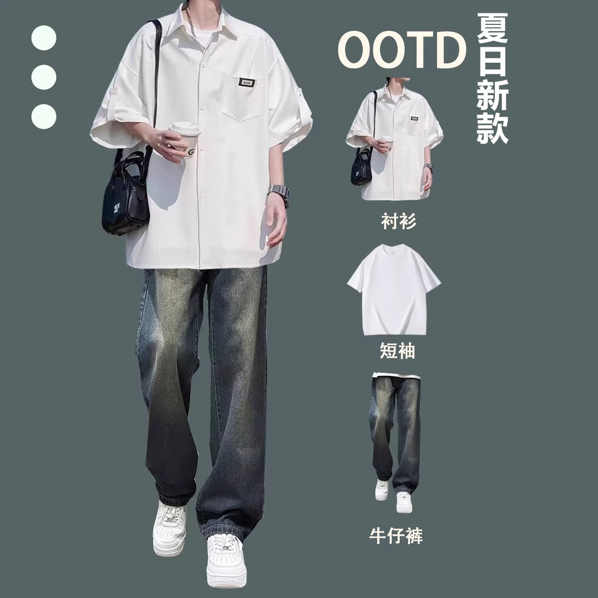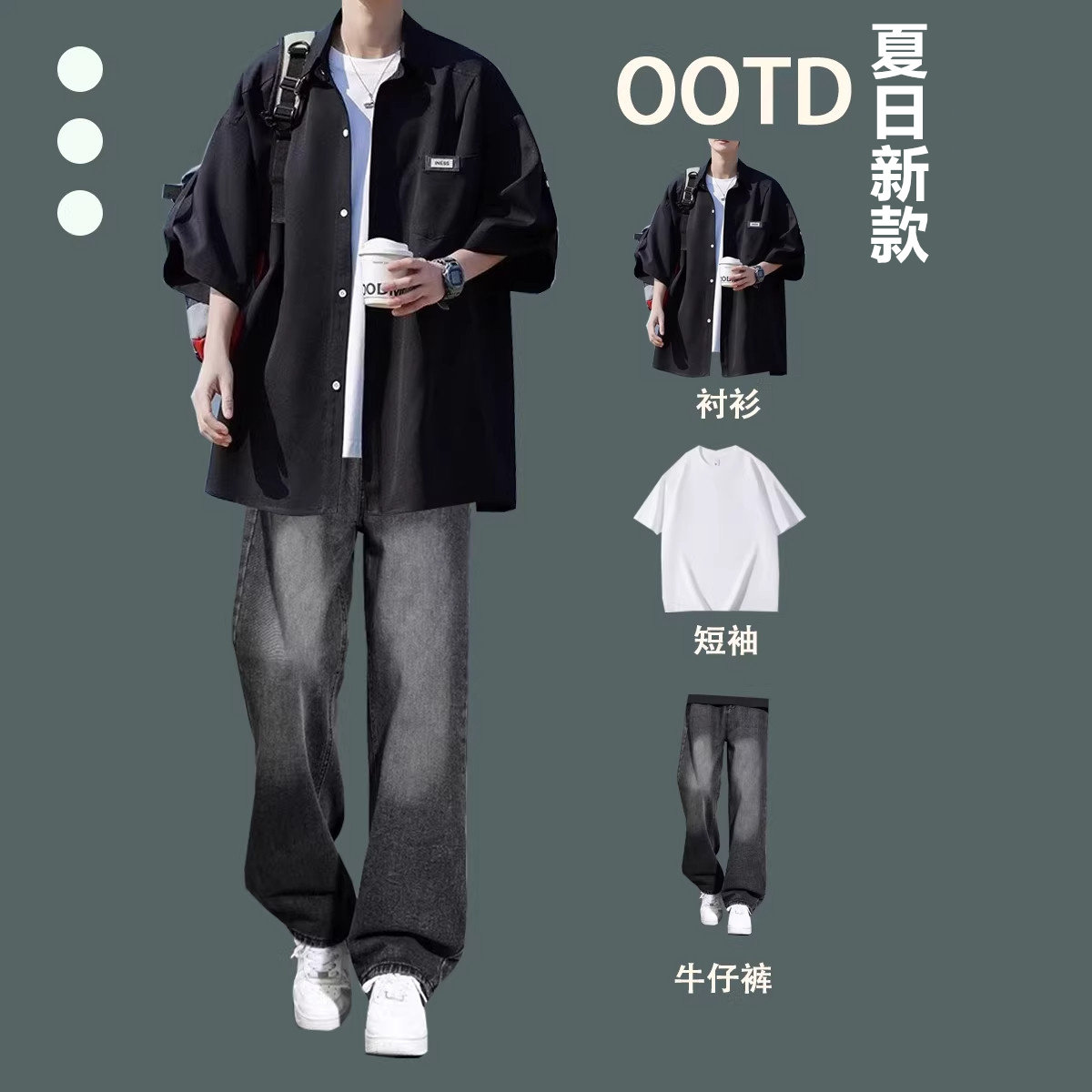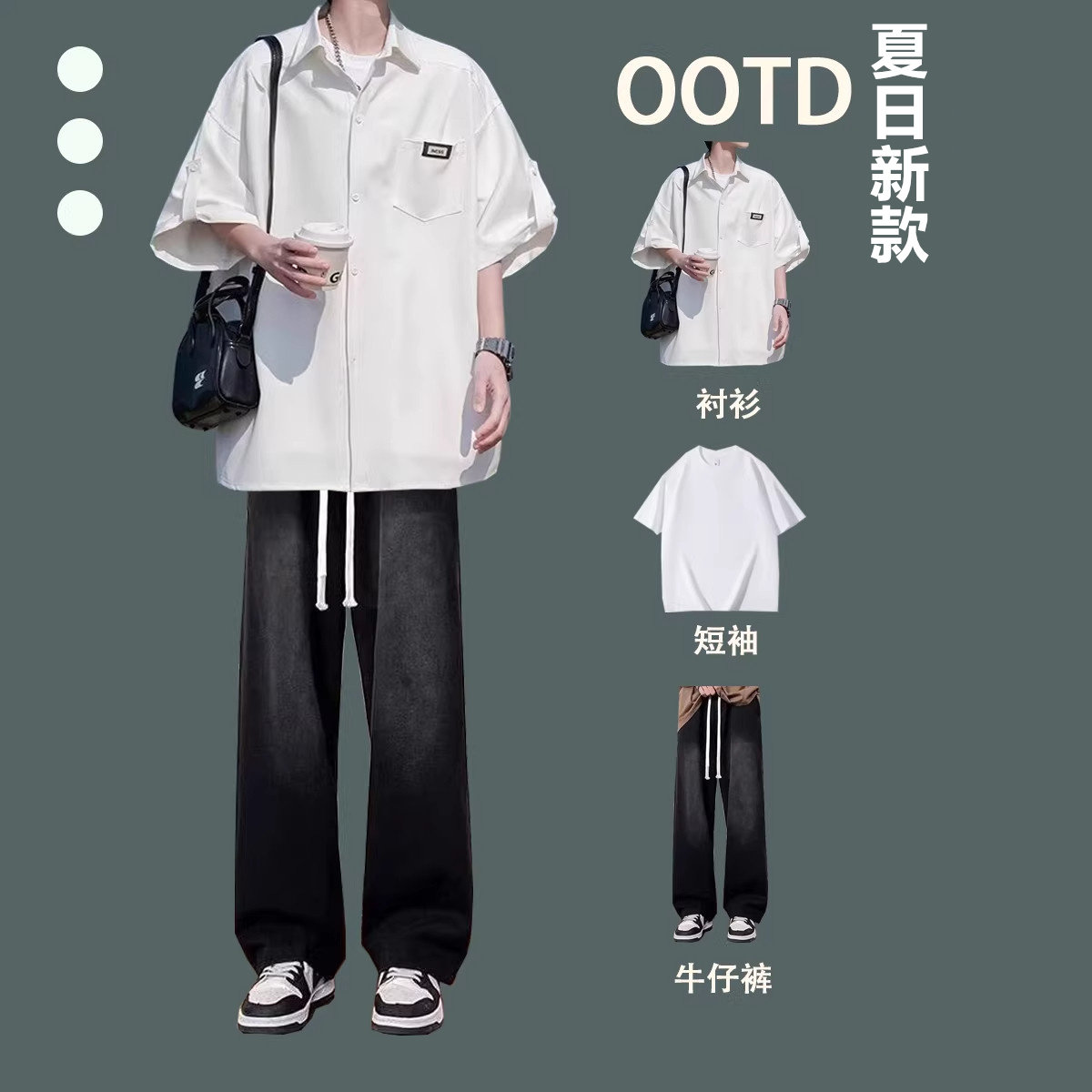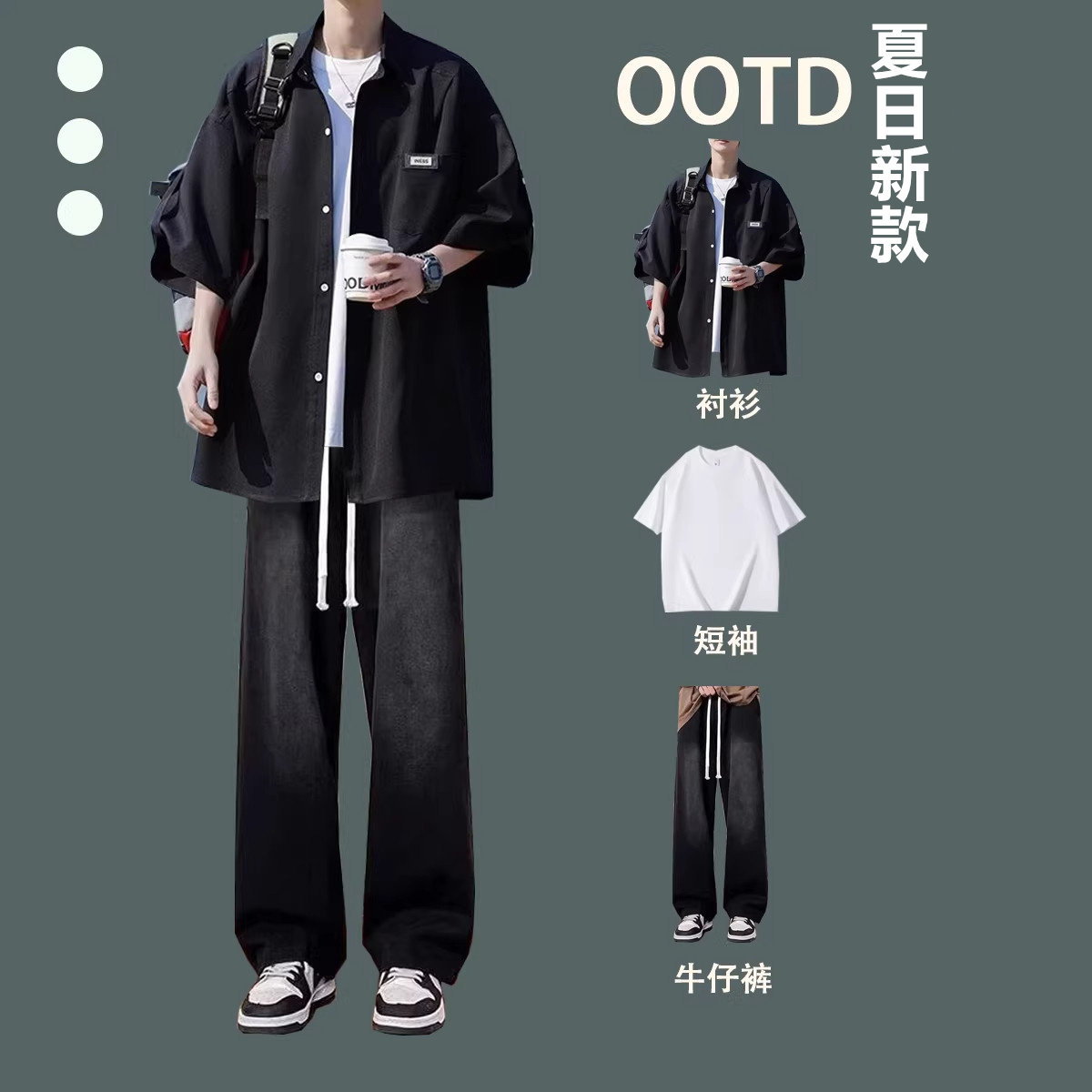 2026夏季冰丝短袖衬衫新款港风男士休闲套装牛仔裤宽松潮流三件套