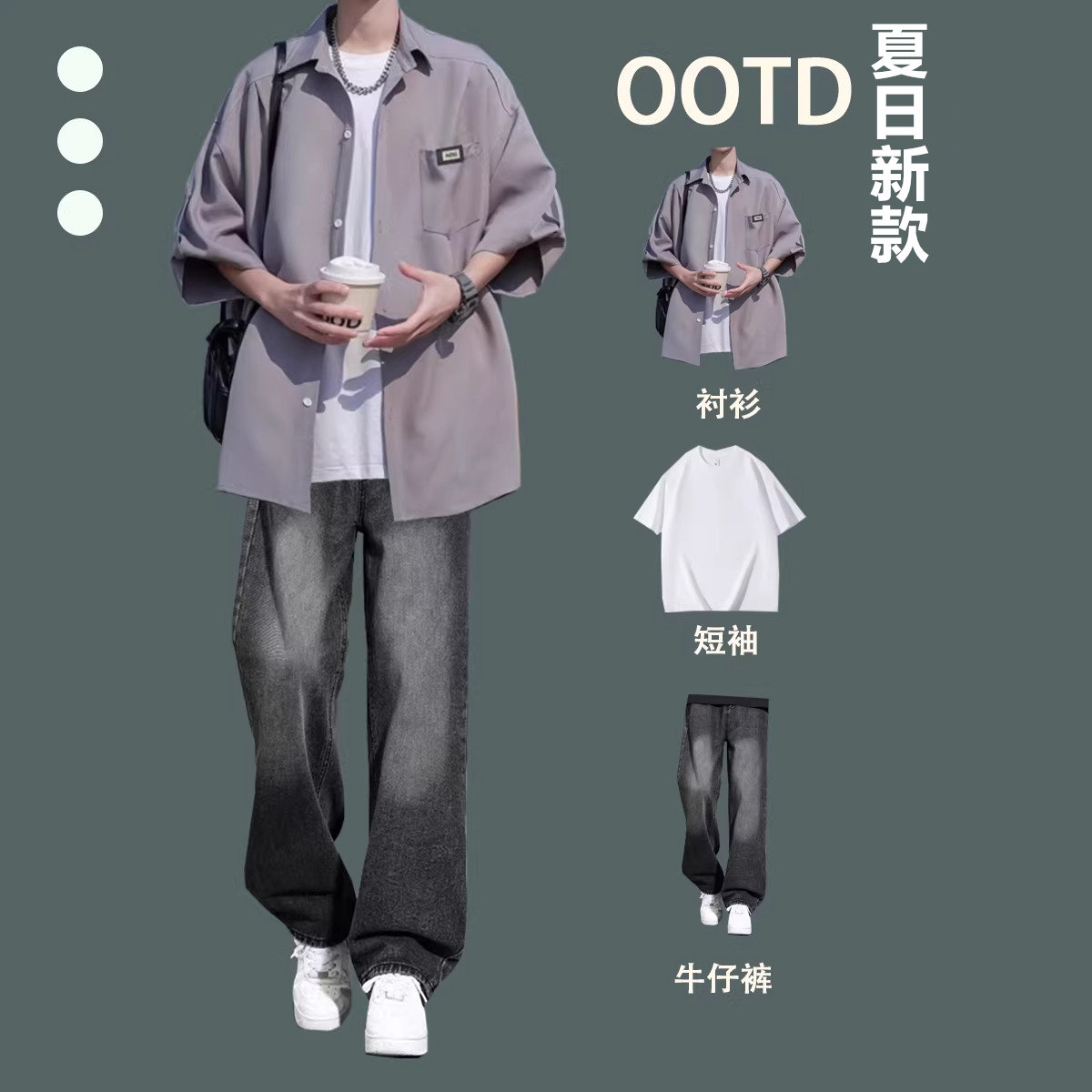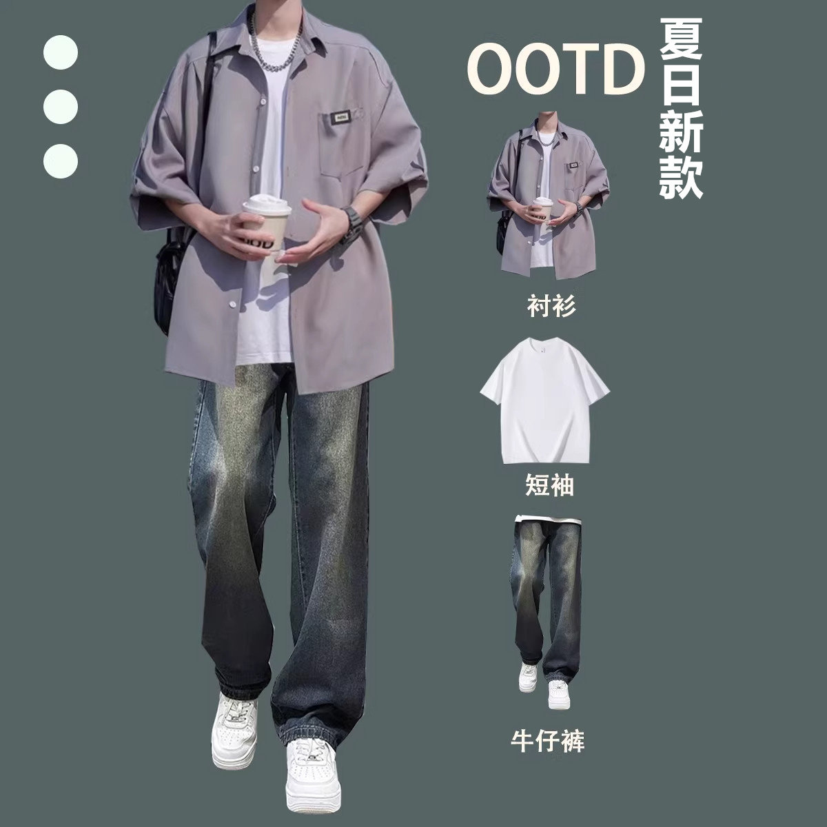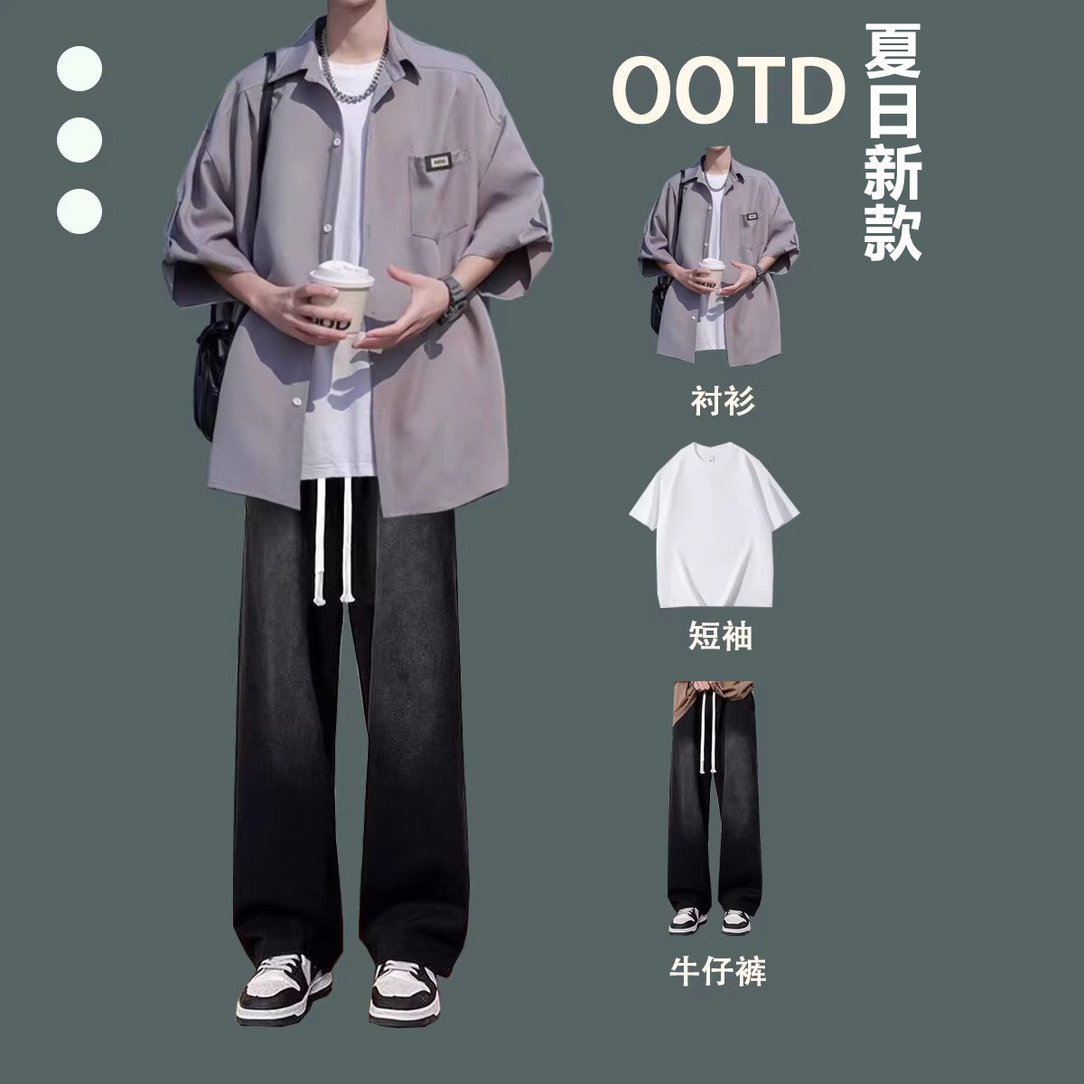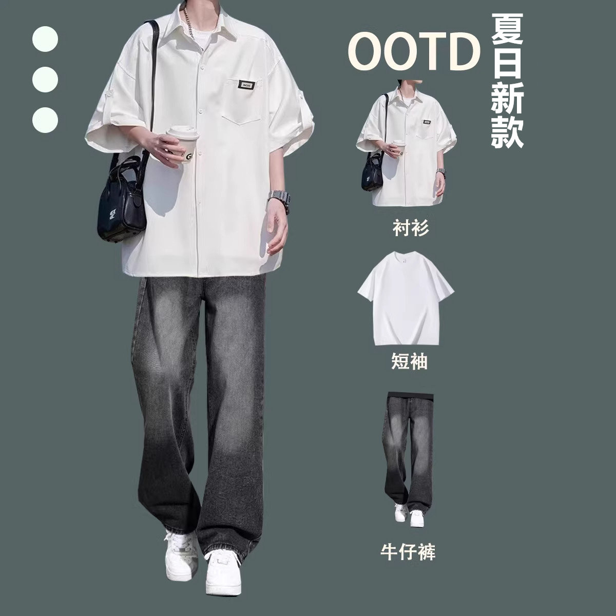2026夏季冰丝短袖衬衫新款港风男士休闲套装牛仔裤宽松潮流三件套